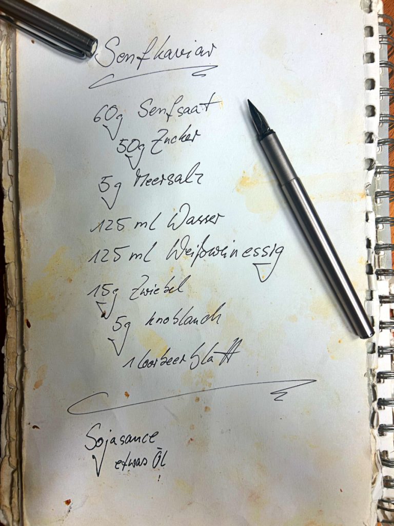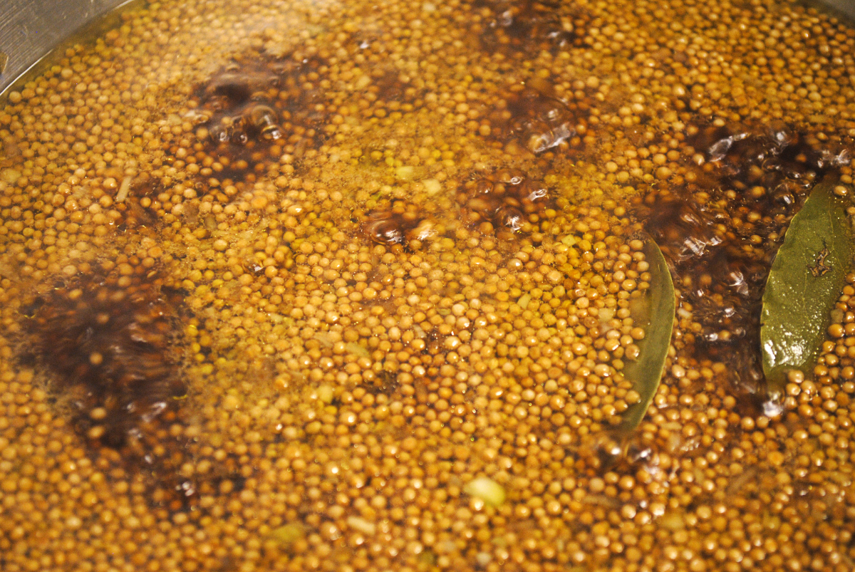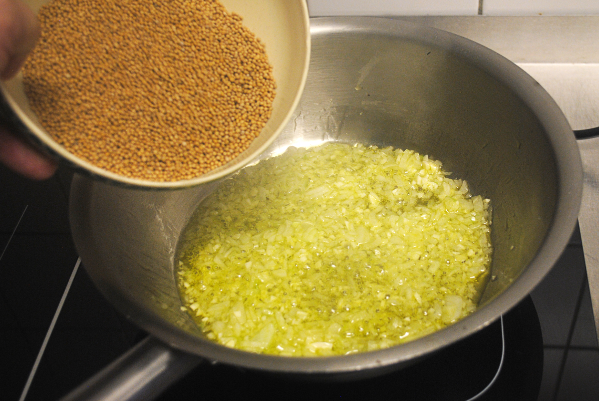 • Senf, Zucker, Meersalz, Wasser und Essig dazugeben und aufkochen.