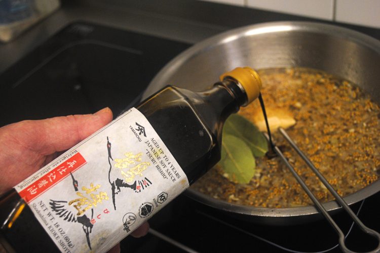 • Den Sud mit einem Schuß Sojasauce etwas andunkeln.